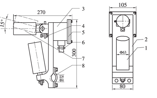 1.固定托輥 2.底板 3.開關(guān)箱 4.調(diào)整螺釘 5.接線腔門蓋 6.出線嘴 7.托輥 8.固定板