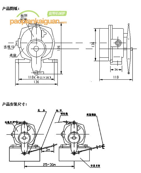 本機采用稱勸式凸輪結(jié)構(gòu),當拉動拉繩開關(guān)的任意一側(cè)或同時拉動兩側(cè)繩索時,均可驅(qū)動凸輪,使開關(guān)動作轉(zhuǎn)換,發(fā)出停機,報警信號。