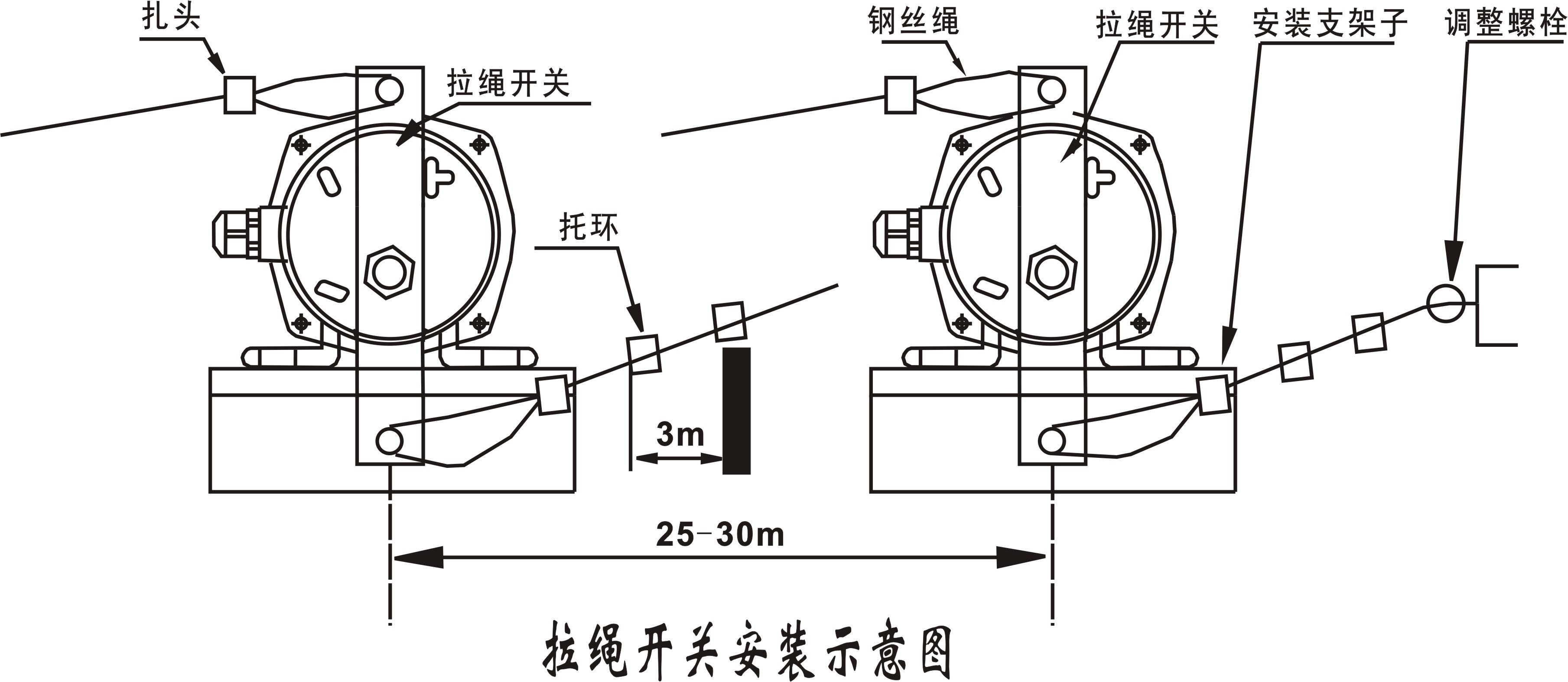 3、為減小鋼絲繩自重對開關復位的影響,每隔2.5m在機架上裝一個托環(huán),以支撐鋼絲繩。